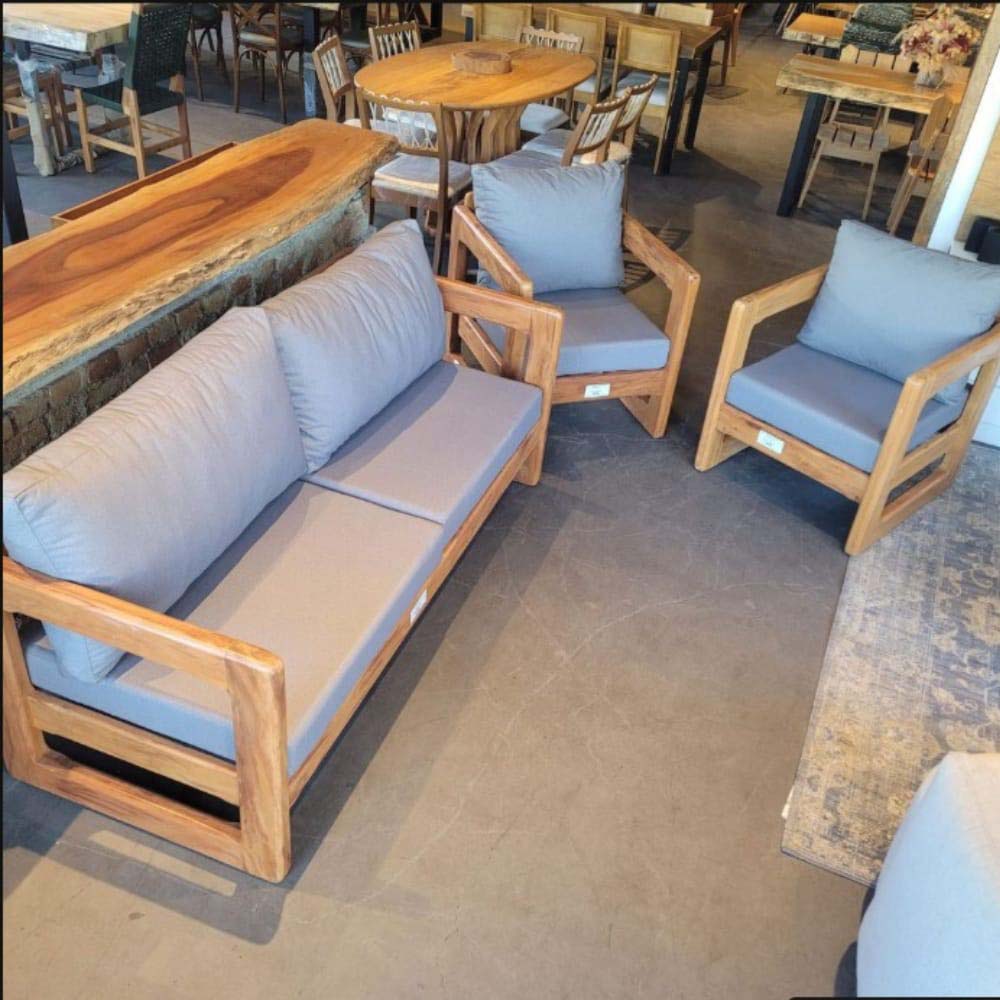 JOGO DE SOFÁ EM PEROBA ROSA E TECIDO ACQUABLOCK 2 E 1 LUGAR